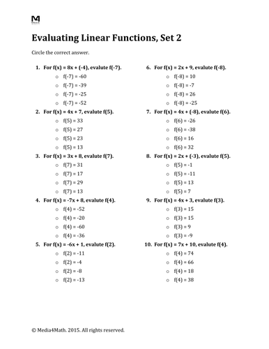 Evaluating functions math worksheets. Evaluate a function Algebra 1 Math Worksheets Get free questions on "Evaluate function" to improve your math understanding and learn thousands more math skills. Math worksheets that are ideal for Algebra I students. Categories Algebra 1, Math Post navigation. Relations: convert between tables, graphs, mappings, and lists of points Algebra 1 Math Worksheets ... Evaluating Functions Activity Teaching Resources | TPT Evaluating Functions Triples ActivityThis triples activity was created to increase students' understanding of function notation. Not only will students practice evaluating functions, but they will also practice solving for x given f (x).Cards A-J: Given a function, evaluate for a given value. Function Worksheets 8th Grade | Download Free PDFs - Cuemath Functions worksheets 8th grade provide a great platform for students to learn the introduction of functions along with questions based on range, domain, evaluating functions, linear and non-linear, and graph problems. The best way to learn the topic of functions is by solving simpler problems and gradually increasing the difficulty level. Algebra Evaluating Expressions Worksheet Systems of equations and inequalities; You may select from 3 and 4 terms with addition, subtraction, and multiplication. These evaluating algebraic expressions worksheet pdfs are designed for students of grade 6 and grade 7. Extension of the concept of a function; Task cards (basic) evaluate each expression and write the answers on the answer page.